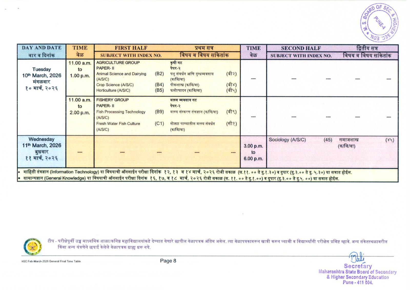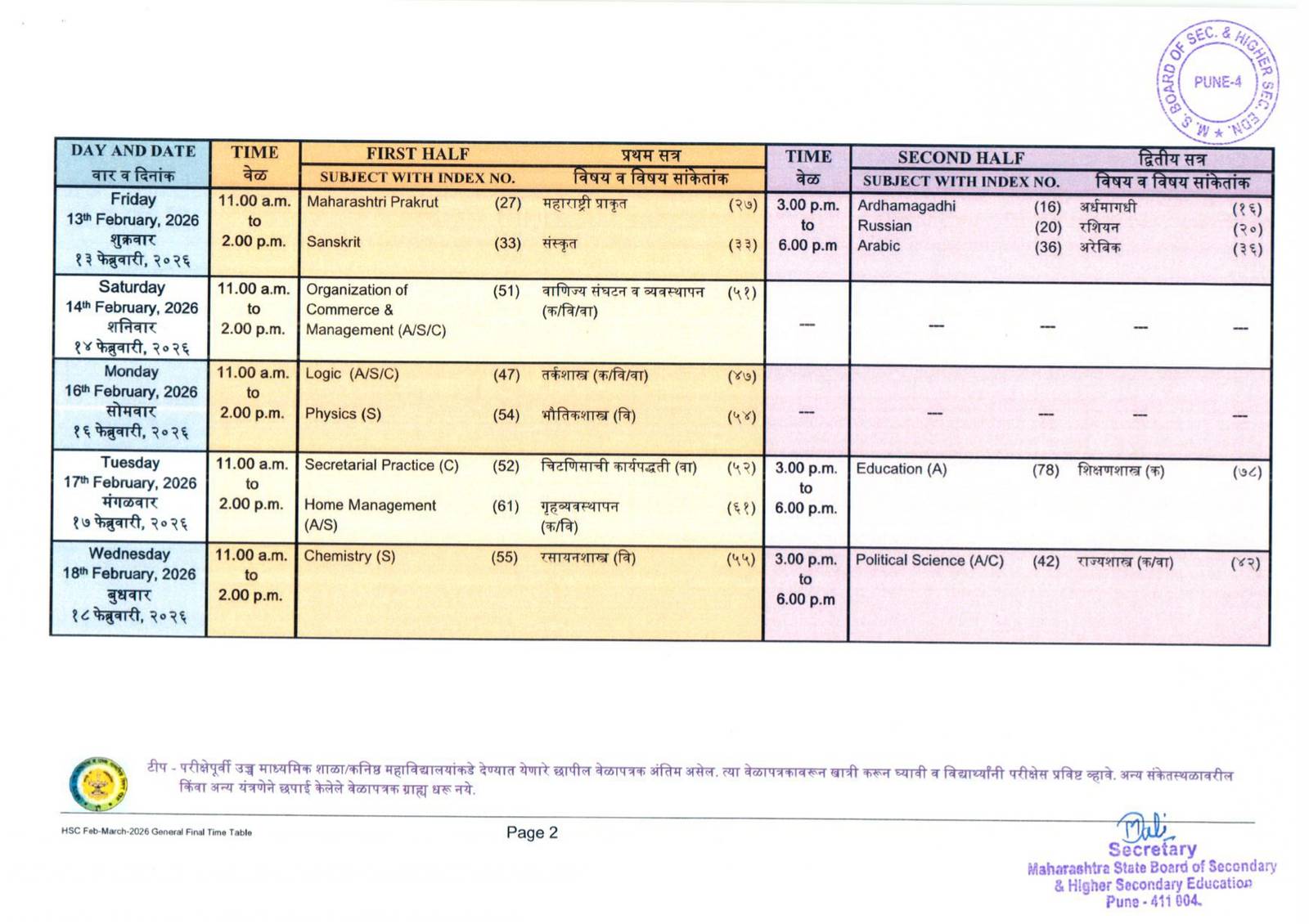 वेळापत्रक – उच्च माध्यमिक प्रमाणपत्र परीक्षा (१२वी) फेब्रुवारी /मार्च २०२६ सर्वसाधारण व द्विलक्षी (व्यावसायिक) अभ्यासक्रम
