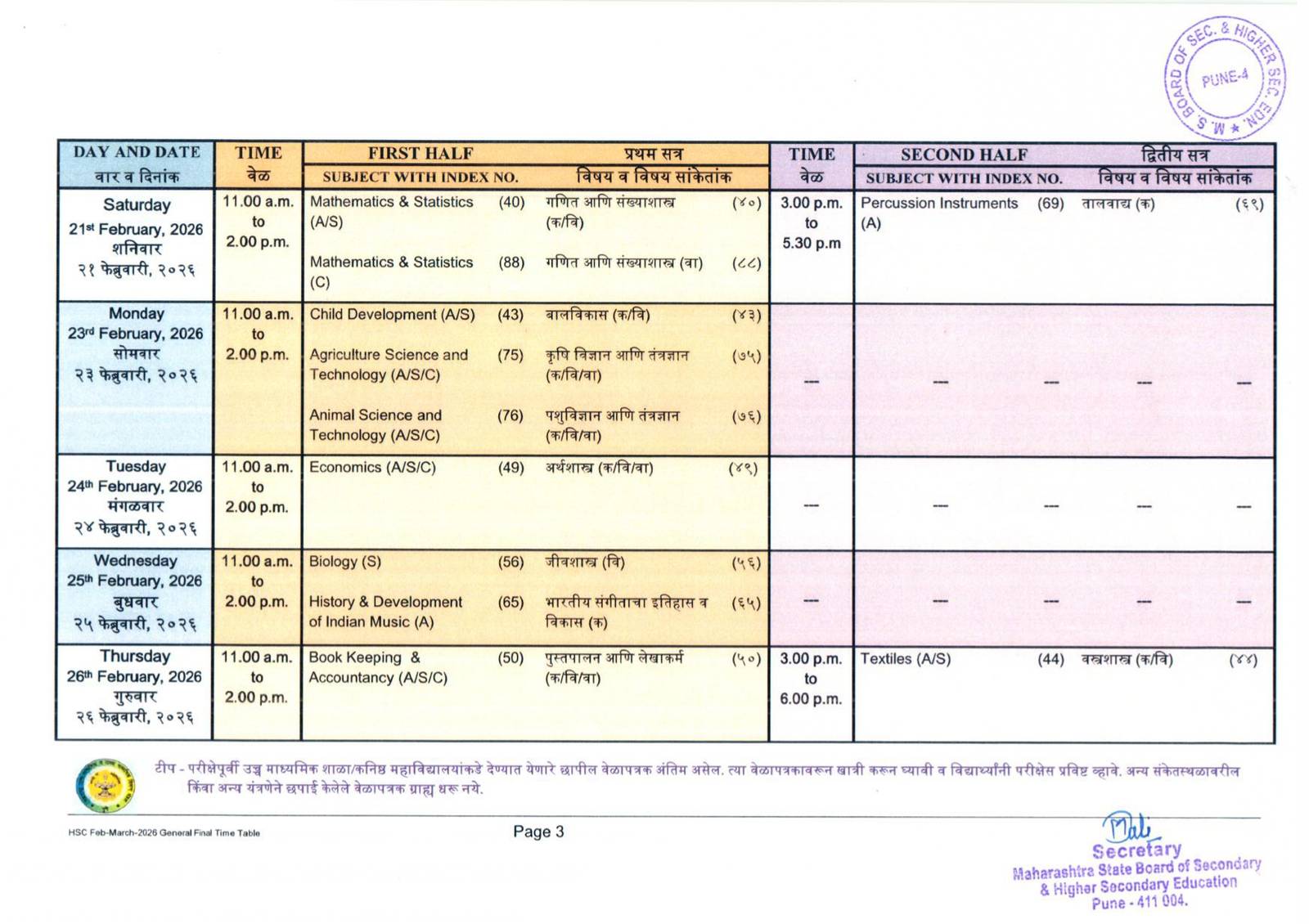 Maharashtra Board 12th Time Table 2026 : The Maharashtra Board 12th Higher Secondary Certificate (HSC) exams  The Maharashtra State Board of Secondary and Higher Secondary Education (MSBSHSE) released the Maharashtra HSC Time Table 2026 on October 31, 2025. The Board will conduct the Maharashtra HSC exams 2026 between February 10 and March 11, 2026 while practical and viva, and internal assessments (along with project work) will take place from January 23 to February 9, 2026. The Board released the detailed Maharashtra HSC time table 2026 on the official website.
