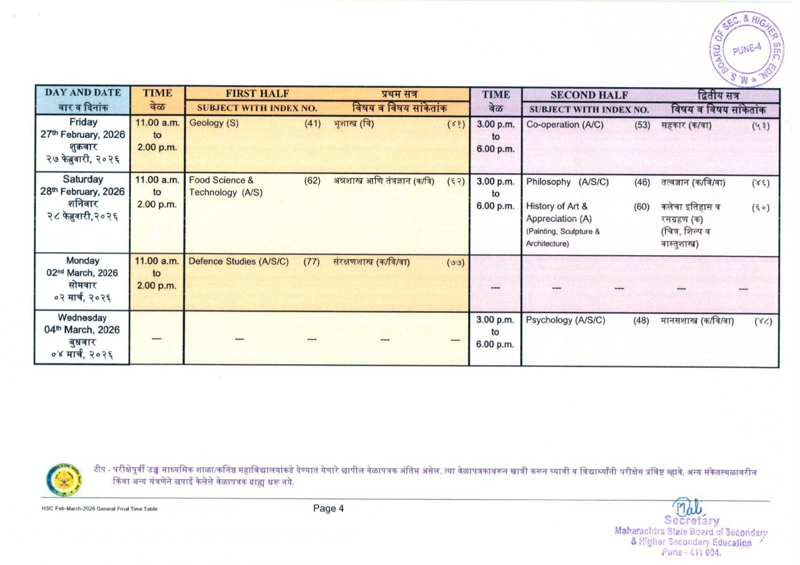 Final Date Sheet for Maharashtra Board 12th HSC Exams 2026