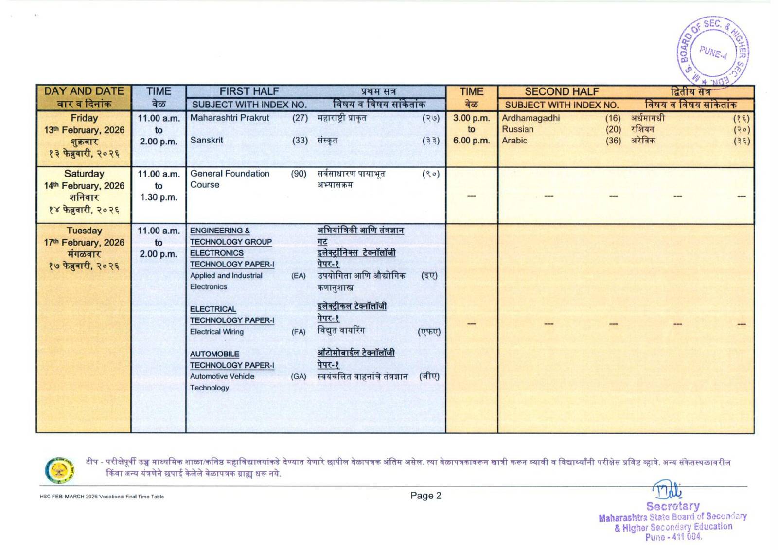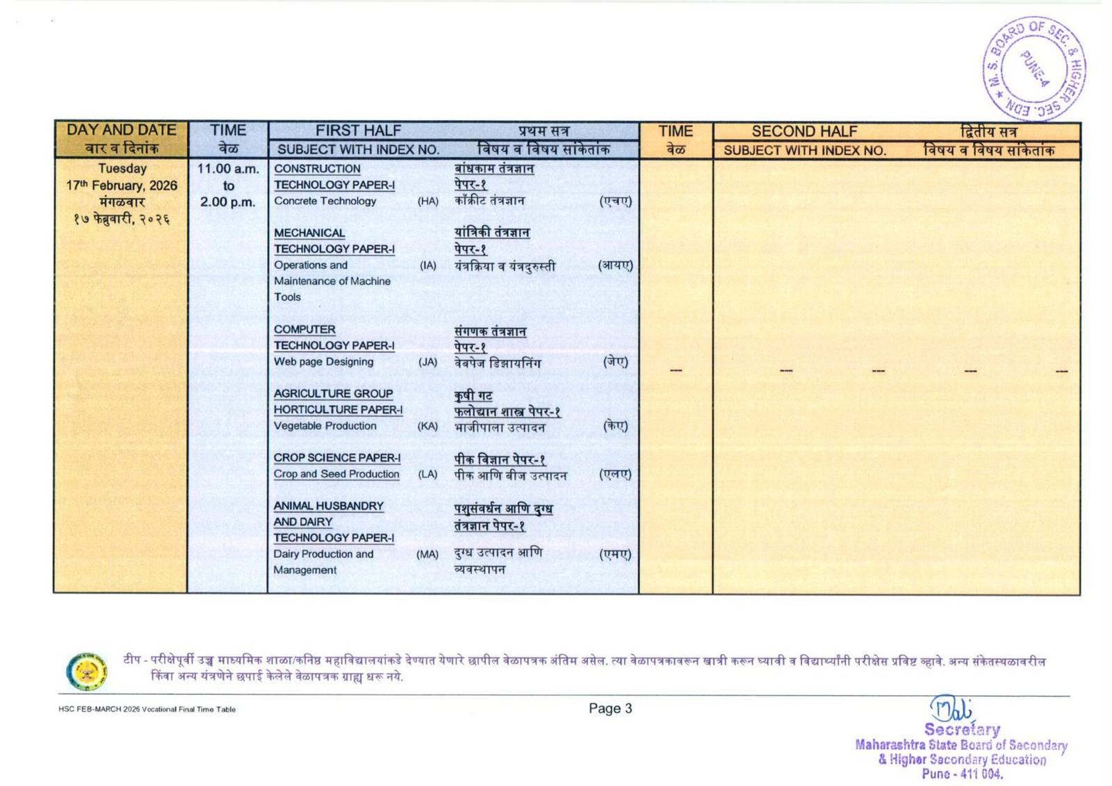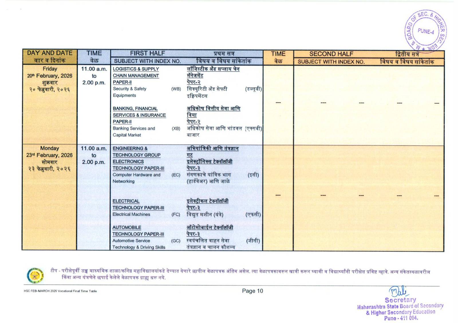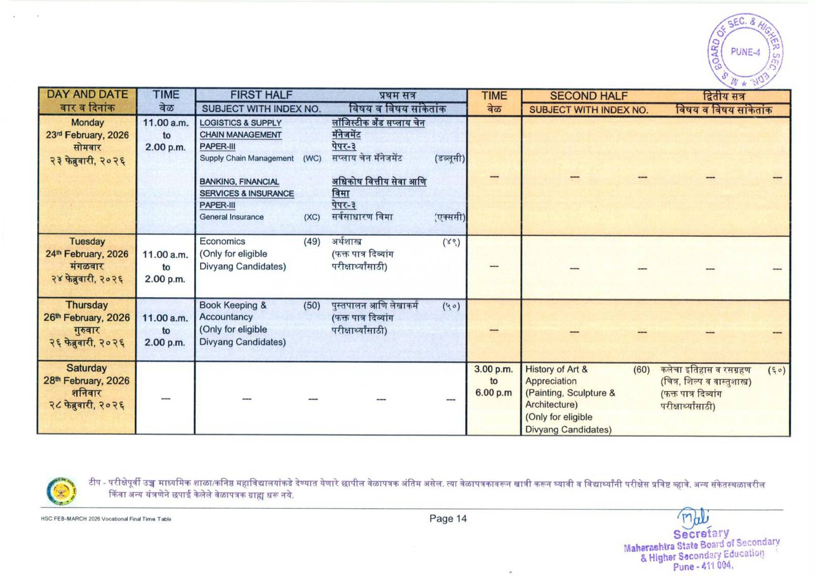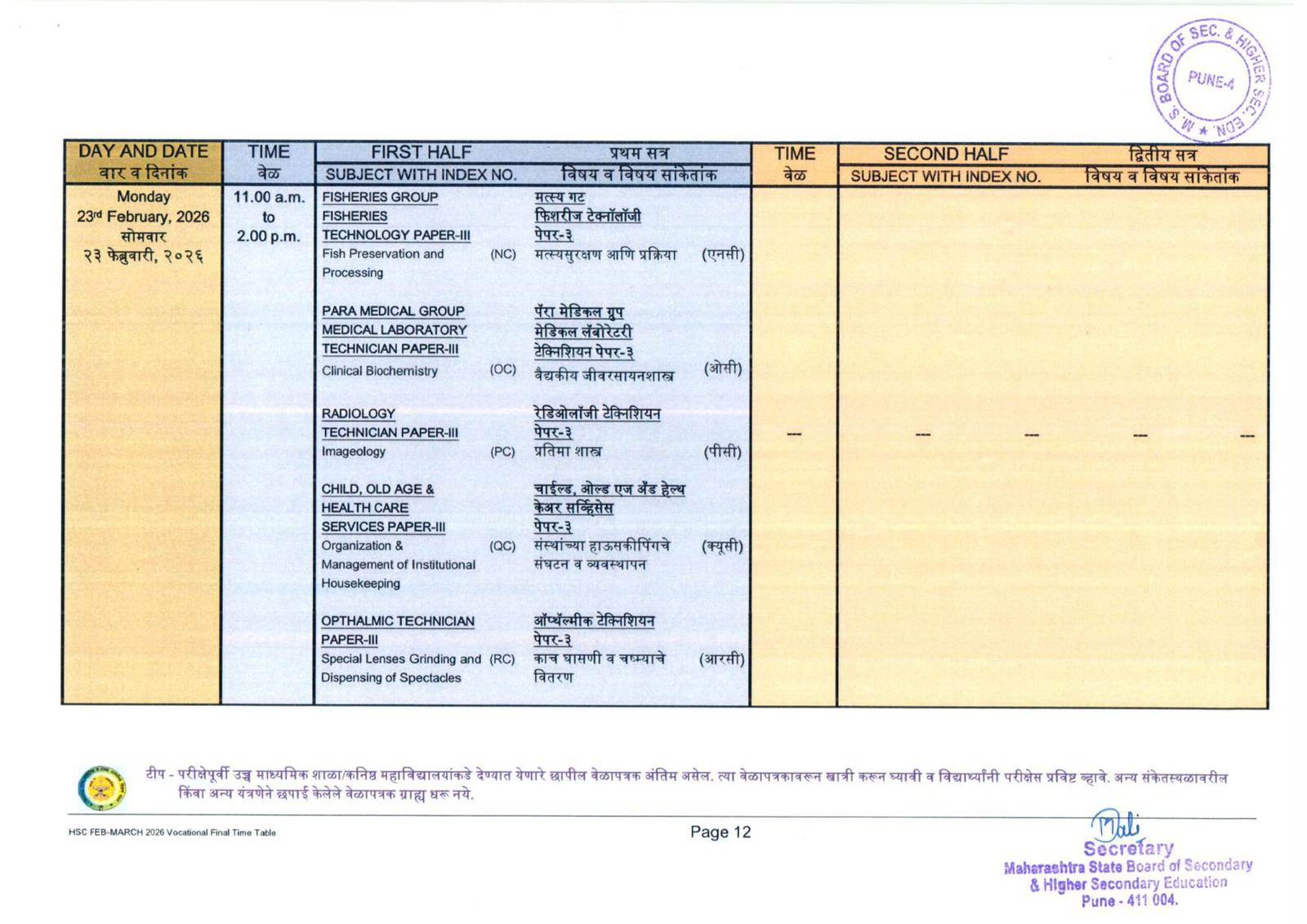 वेळापत्रक – उच्च माध्यमिक प्रमाणपत्र परीक्षा (१२वी) फेब्रुवारी /मार्च २०२६ व्यवसाय अभ्यासक्रम