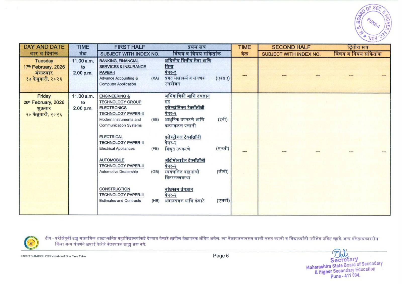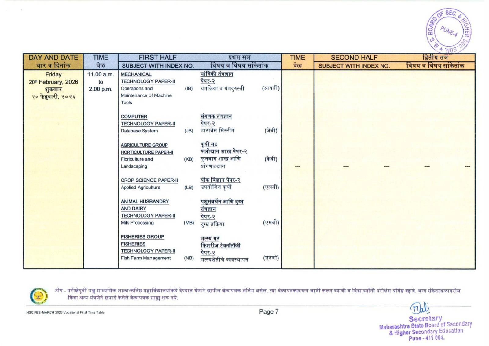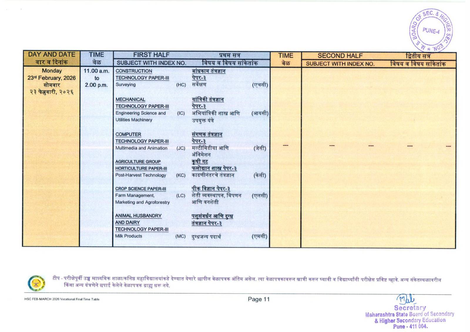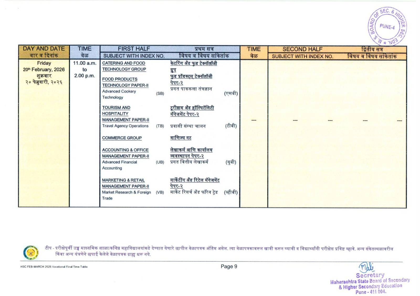 वेळापत्रक – उच्च माध्यमिक प्रमाणपत्र परीक्षा (१२वी) फेब्रुवारी /मार्च २०२६ व्यवसाय अभ्यासक्रम