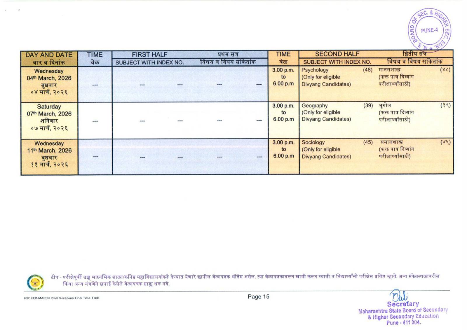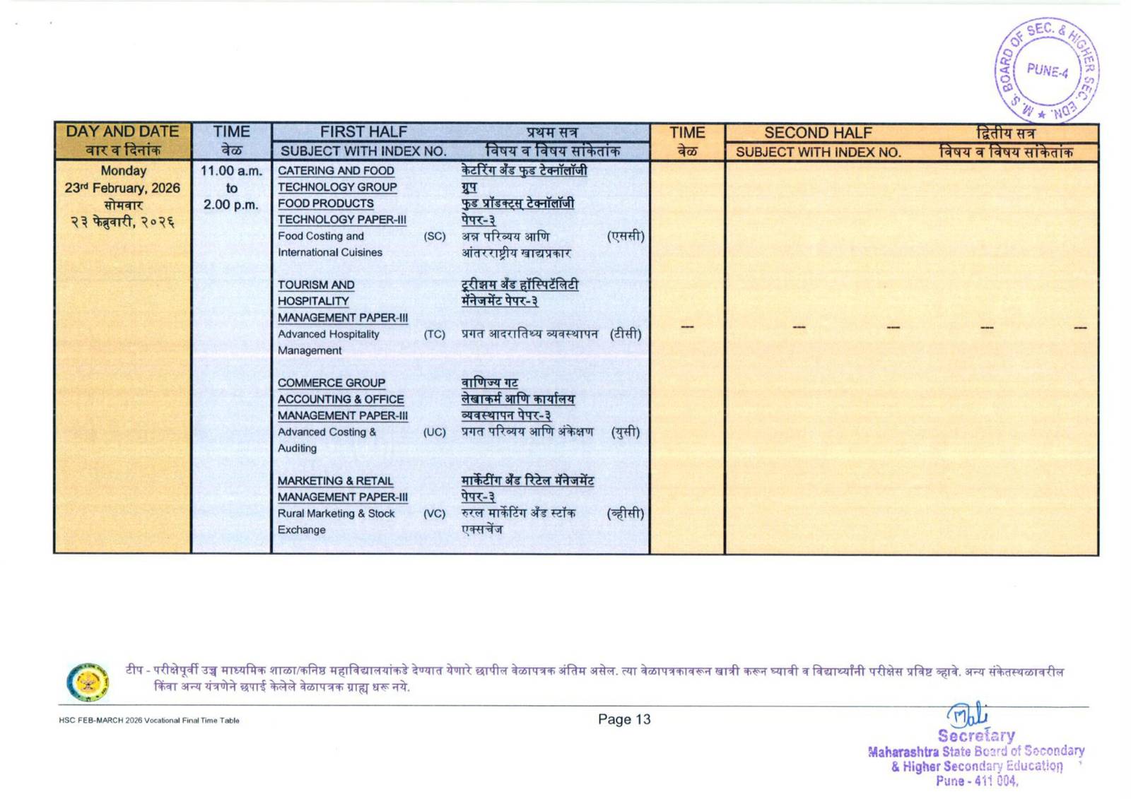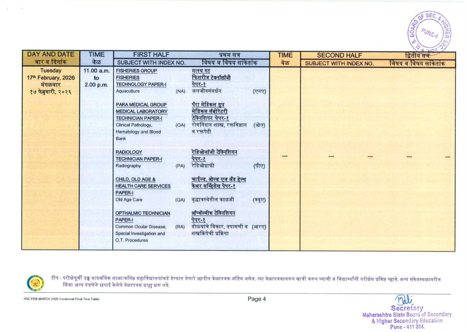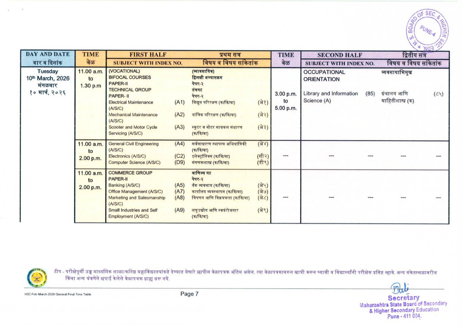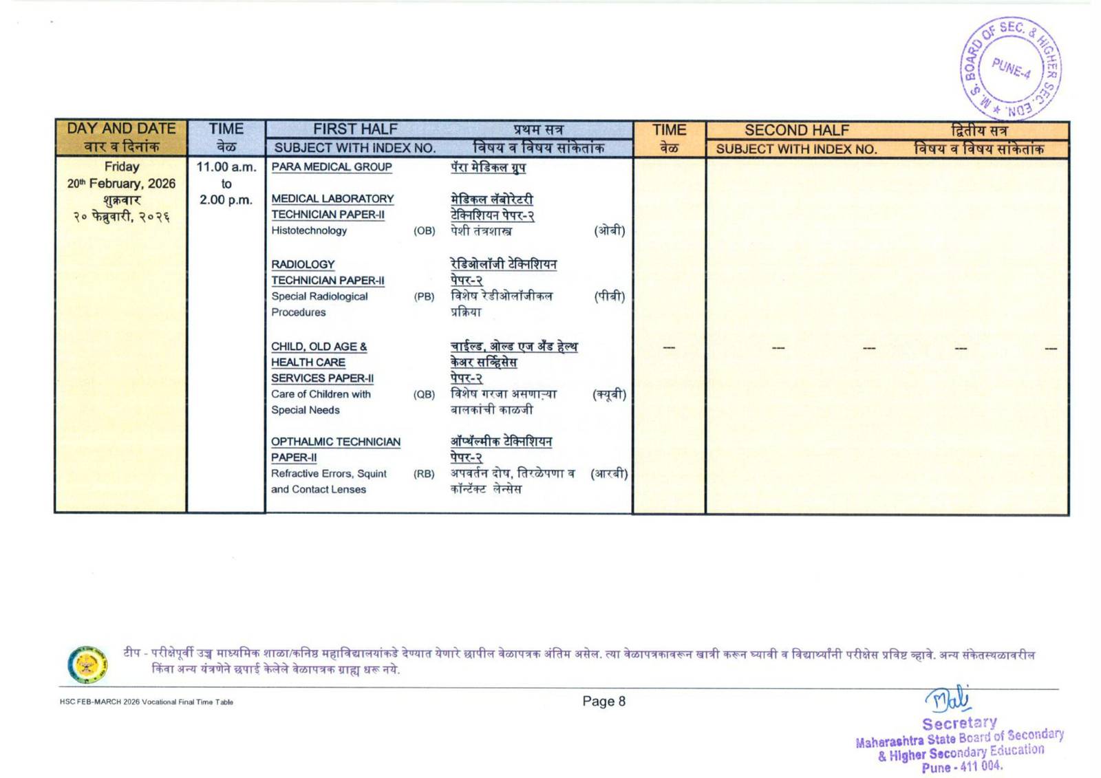 वेळापत्रक – उच्च माध्यमिक प्रमाणपत्र परीक्षा (१२वी) फेब्रुवारी /मार्च २०२६ व्यवसाय अभ्यासक्रम