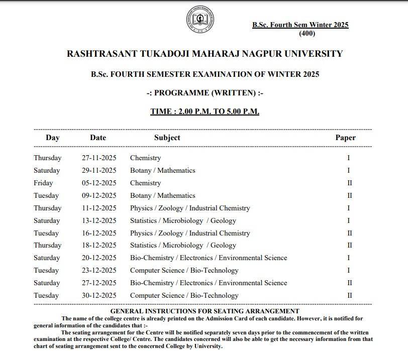 You can get complete information about Nagpur University B.Sc 2nd, 4th & 6th Sem (NEP) October / November 2025 Exam on this page. Here on this page we are providing RTMNU UG/PG 1st,2nd, 3rd,4th, 5th, 6th Sem Exam Date Sheet downloading official link after it official declaration