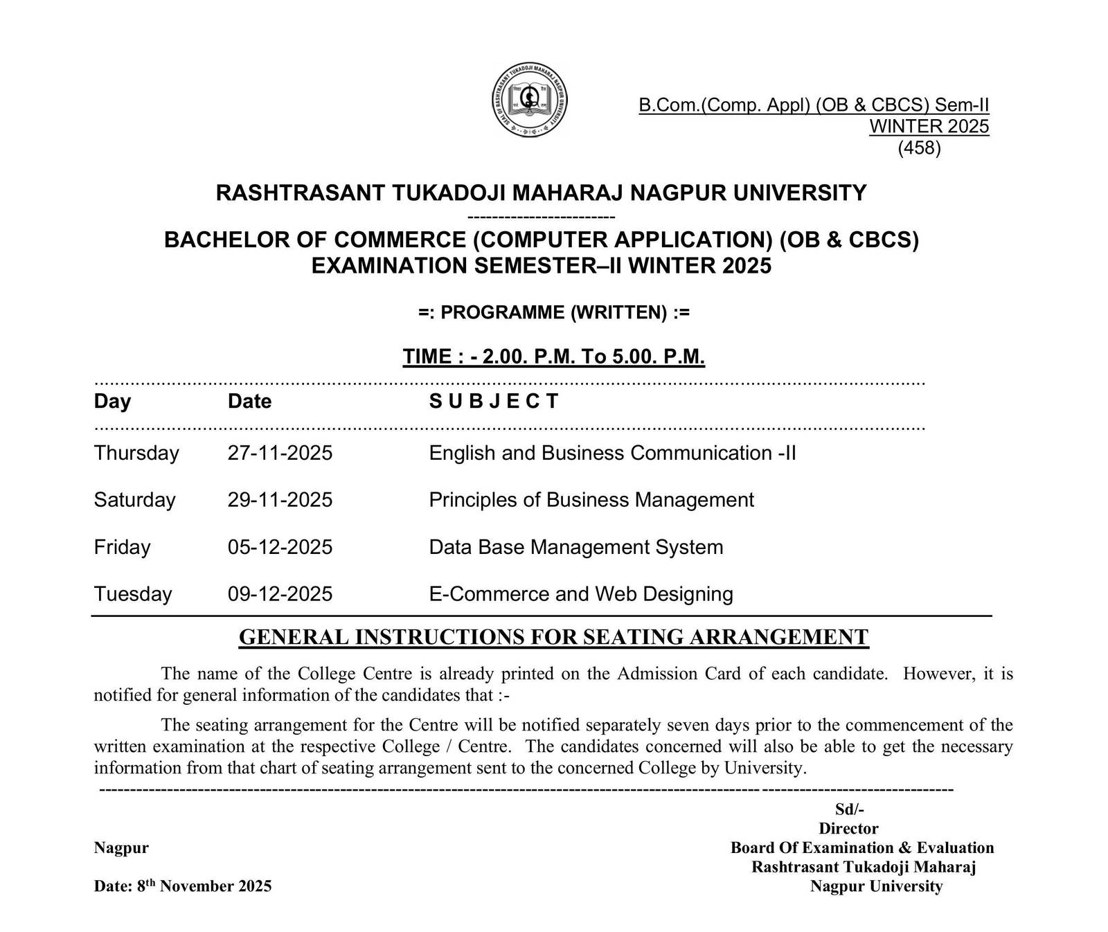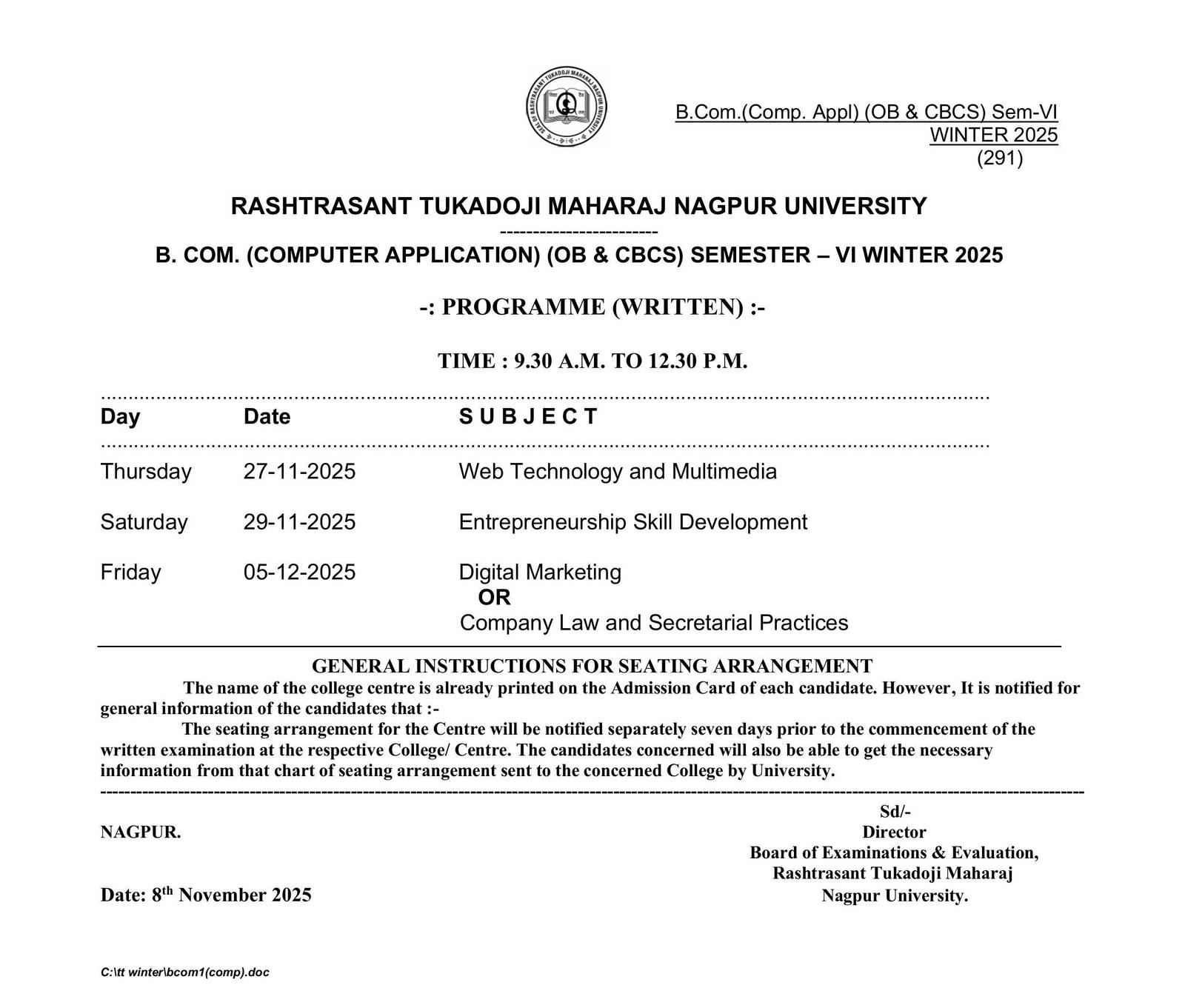 RTMNU BCCA 2nd 4th 6th Sem OB CBCS Time Table Winter 2025 : RTMNU Exam Time Table Winter 2025 has been released by Rashtrasant Tukadoji Maharaj Nagpur University. On the official website www.nagpuruniversity.ac.in, The Nagpur University UG PG Winter Exam Time Table is accessible in an online mode.